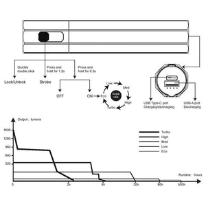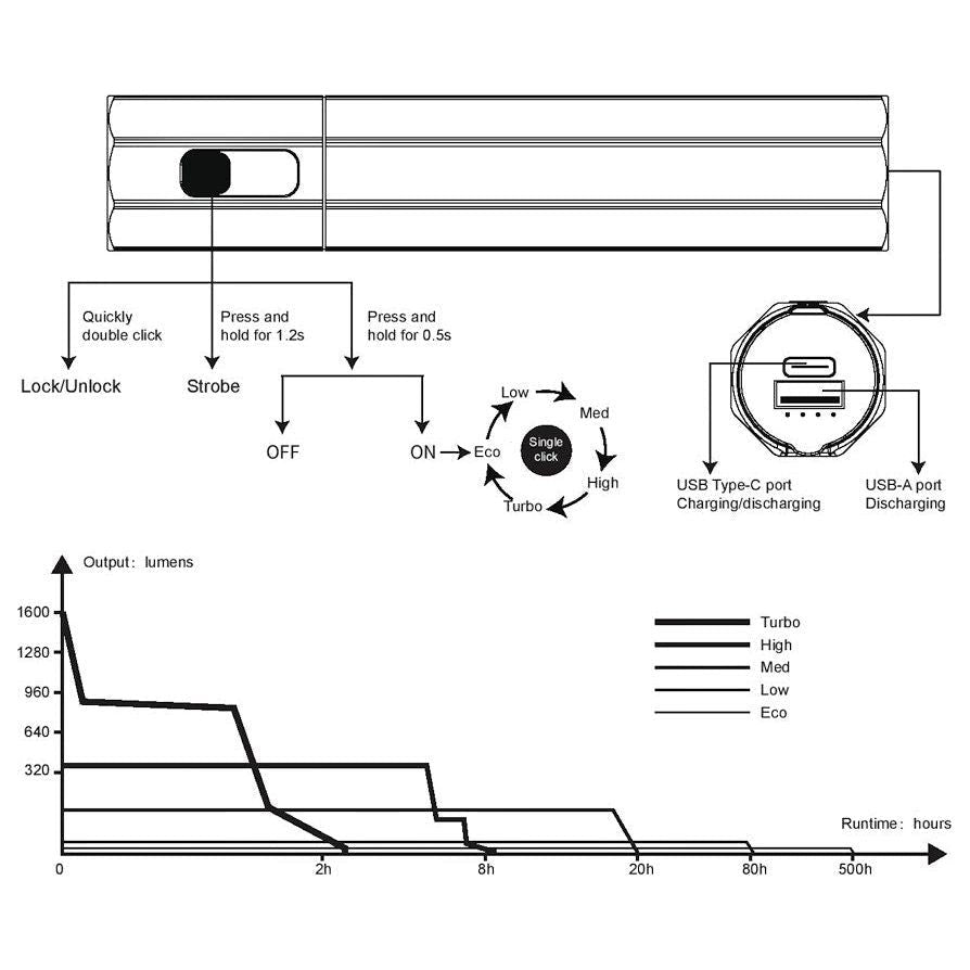OUTPUT/RUNTIME Turbo: 1600 Lumens (2 hrs 30 mins), High: 350 Lumens, (8 hrs 30 mins), Med: 150 Lumens, (20 hrs), Low: 30 Lumens, (84 hrs), Eco: 3 Lumens, (504 hrs), Strobe: 1600 Lumens