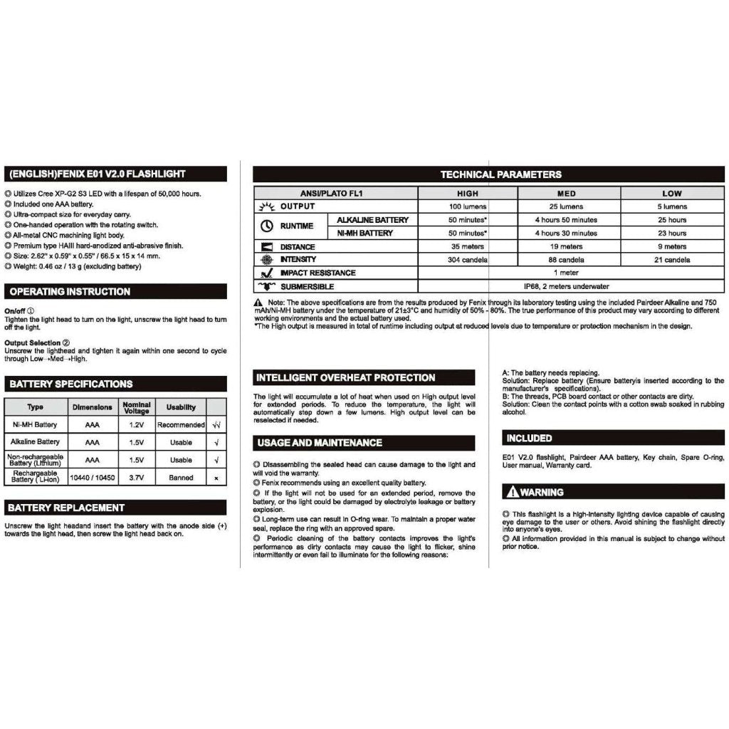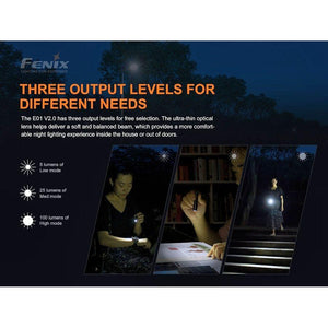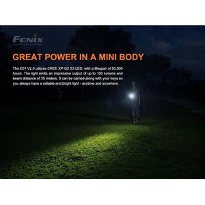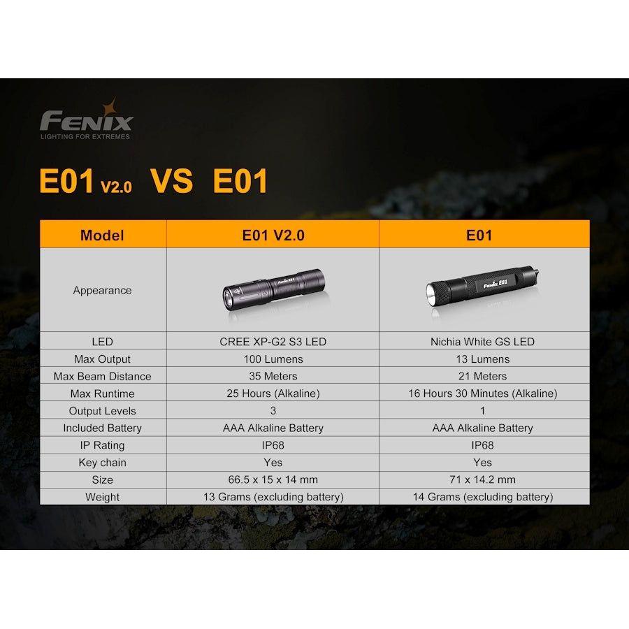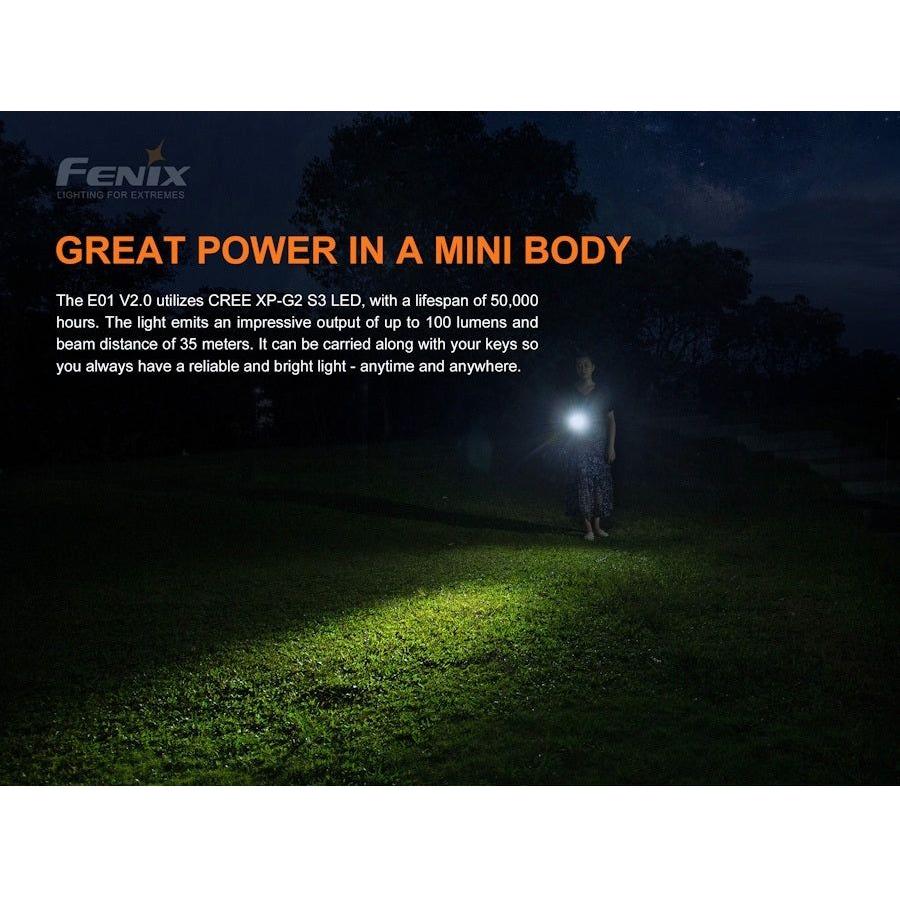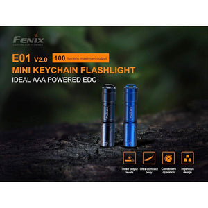 he Fenix E01 V2.0 is an ultra-compact Keychain flashlight with a max output of 100 Lumens.