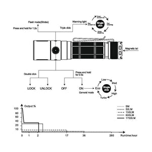 Lock: with the light switched off, triple click the switch to lock the light, the light will blink twice in Eco mode to indicate locked status.