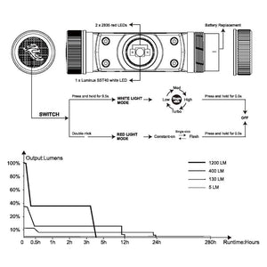 Neutral-white light - Turbo: 1200 Lumens (4 hrs), High: 400 Lumens (12 hrs), Med: 130 Lumens (23 hrs 40 min), Low: 5 lumens (280 hrs).