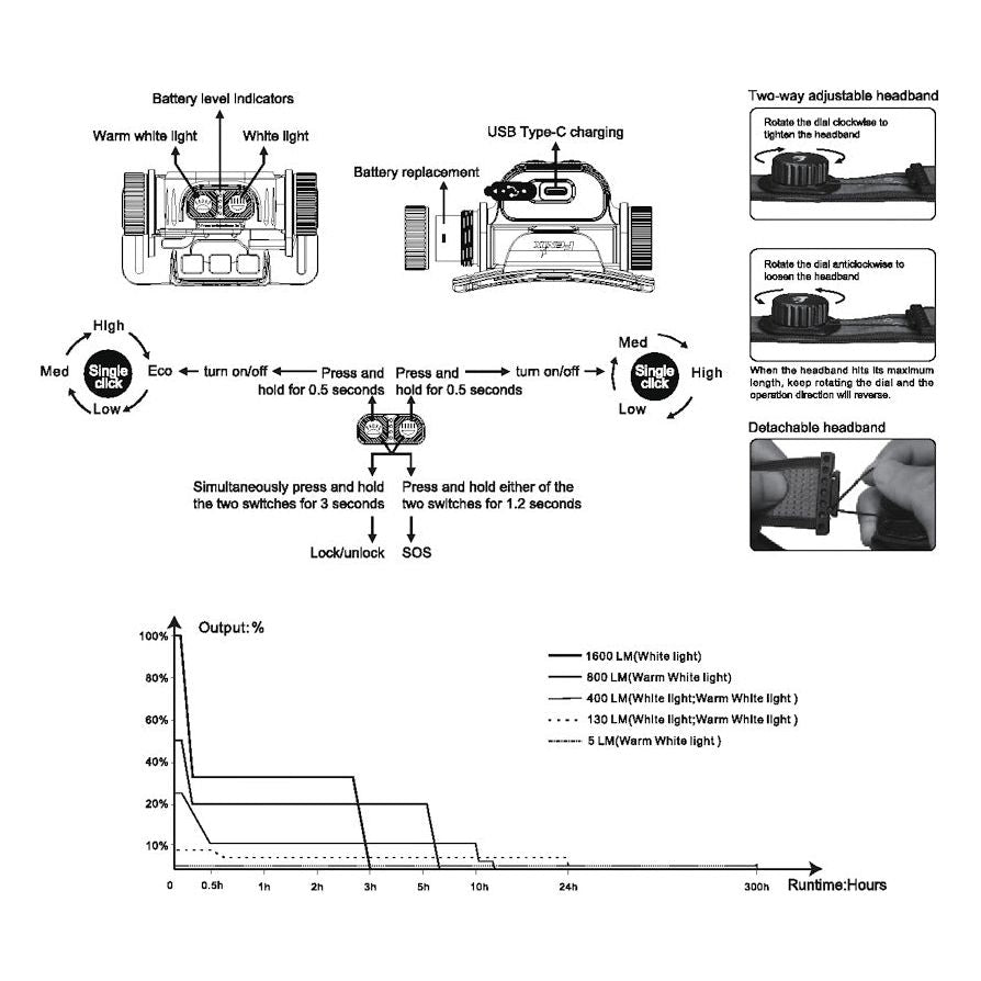 * In SOS mode, press and hold the warm white light switch for 1.2 seconds to shift to the Eco output of warm white light mode.