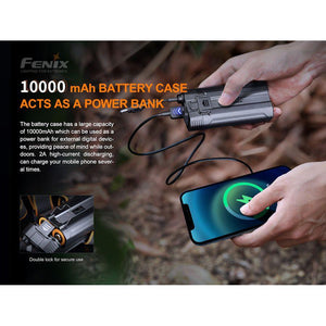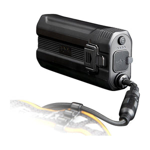 The heavy duty battery pack features a double locking lid mechanism and contains 2 x 5000mAh batteries, easily exchanged for spares to keep the light shining. These are standard Fenix 21700 batteries rather than a dedicated pack, so spares can be purchased at reasonable cost. The battery case incorporates a 4 x LED meter displaying charging and battery level status, plus a USB- OUT socket for use as a 10,000 mAh power bank.