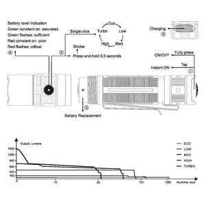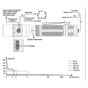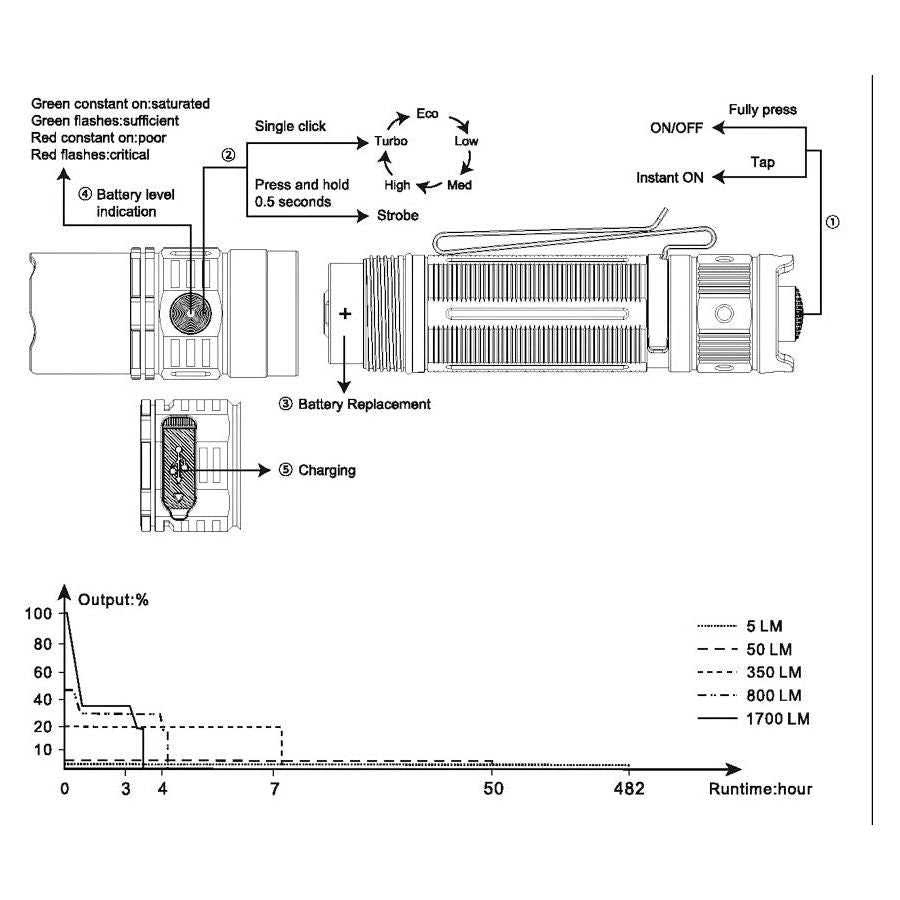 OUTPUT/RUNTIME Turbo: 1700 Lumens (3 hrs 30 mins), High: 800 Lumens, (4 hrs 15 mins), Med: 350 Lumens, (7 hrs 45 mins), Low: 50 Lumens (50 hrs), Eco: 5 Lumens (482 hrs), Strobe: 1700 Lumens