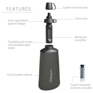 - Includes: LifeStraw Peak Series 650ml collapsible squeeze bottle with screw-top cap and tether, backwash accessory, user manual