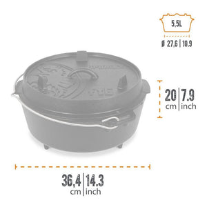 Thanks to the amazing characteristics of cast iron and the special structure of the surface, warmth is efficiently stored and distributed. The pre-treated surface (seasoned finish) makes a first seasoning unnecessary, and the sturdy Dutch oven can be used right away. In the open air, it is used on an open fire or with charcoal and briquettes. The raised edge of the lid makes it possible to place embers or charcoal also on the Dutch oven. The Dutch oven is thus heated from all sides and is for example suitable for baking bread.