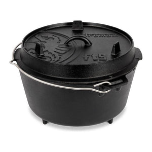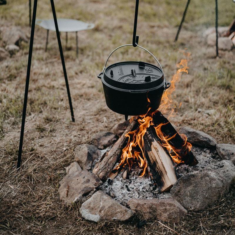 Thanks to the amazing characteristics of cast iron and the special structure of the surface, warmth is efficiently stored and distributed. The pre-treated surface (seasoned finish) makes a first seasoning unnecessary, and the sturdy Dutch oven can be used right away. In the open air, it is used on an open fire or with charcoal and briquettes. The raised edge of the lid makes it possible to place embers or charcoal also on the Dutch oven. The Dutch oven is thus heated from all sides and is for example suitable for baking bread.