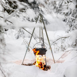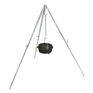 With the Petromax Cooking Tripod everyone will enjoy a great outdoor-cooking experience. It can be easily and safely hung up a barbecue grate as well as a Petromax Dutch Oven. Due to its variable chain the distance between Dutch Oven or kettle and the fire can be easily altered at any time. The bevelled feet make sure that the tripod remains robust and safe on all kinds of surfaces. Each leg is continuously height-adjustable to keep the tripod evenly balanced in case of uneven ground.