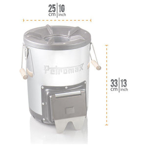 The self-sufficient Petromax Rocket Stove properly and quickly heats up your cookware to prepare a sumptuous, hearty meal. The compact stove is perfectly designed for this purpose, as it burns branches, twigs or pine cones particularly effectively. Due to the excellent downward insulation, you can also place your Rocket Stove on a camping table and start your cooking adventure, since the heat is concentrated in a small space in the middle of the stove.